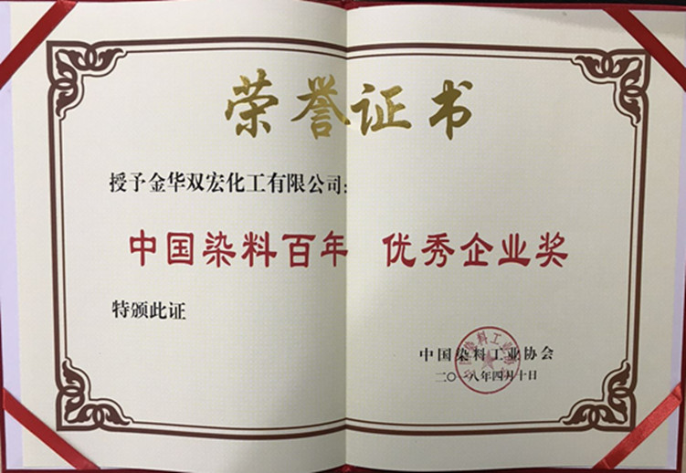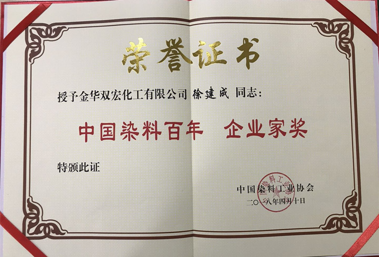 2018年4月10日,中國染料工業(yè)協(xié)會在上海舉辦了“中國染料百年輝煌總結(jié)表彰大會”,在大會表彰環(huán)節(jié)中,雙宏榮獲“中國染料百年企業(yè)獎”,董事長徐建成榮獲“中國染料百年企業(yè)家獎”榮譽。